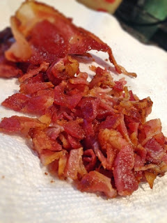 Brush or spray on hot waffle iron with butter. Spoon about 1/2 cup of batter onto iron, then sprinkle on the bacon evenly. This first waffle will be the tester, adjust the temperature to cook until it becomes golden brown. Remove to the plate and keep warm.